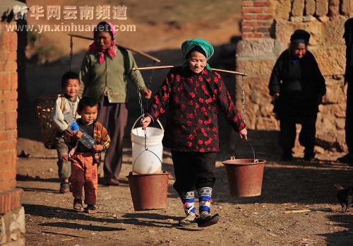 自去年入秋以來,云南省曲靖市沾益縣西平鎮青山崖村遭遇秋、冬、春三季連旱。家住當地的陳世花老人家中的20多畝地無法耕種。她的兒子、兒媳和孫女只好外出打工。去年12月以來,由于家中的自來水斷流,陳世花老人每天都到一里地外的村口去挑水,用來做飯、澆地、喂豬。