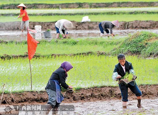 欽州市農民抓住近期連續三次降雨帶來充盈雨水的有利時機,迅速掀起早稻插秧的熱潮。由于受旱情的影響,欽州市早稻插秧時間比往年推遲了一個星期。該市采取人工增雨的辦法,全力確保農民搶插早稻用水。圖為4月8日,欽州市欽南區沙埠鎮海棠村農民正在田里插秧。記者 喻湘泉攝
