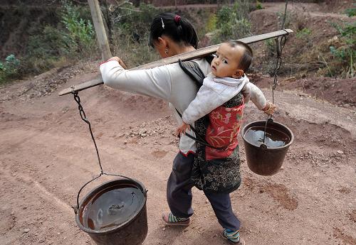 4月21日,在云南省楚雄市東華鎮(zhèn)達(dá)苴村,一位背著孩子的彝族婦女把送水車(chē)送來(lái)的水挑回家。新華社記者 藺以光 攝