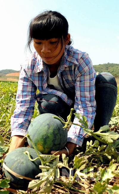 4月23日,百色市右江區永樂鄉三合村農婦王美金在田間摘取西瓜。