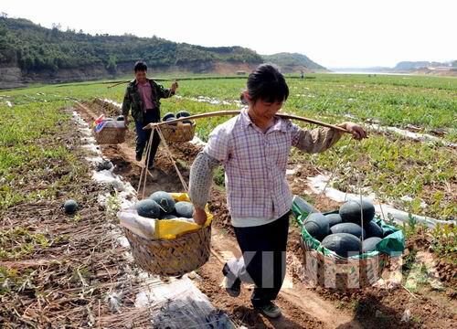 4月23日,百色市右江區永樂鄉瓜農盧斌雄夫婦挑運收獲的西瓜。