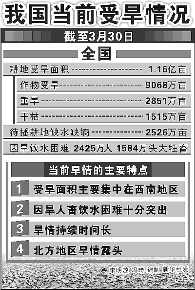 國家防總統計顯示,截至3月30日,全國耕地受旱面積1.16億畝,其中作物受旱面積9068萬畝,待播耕地缺水缺墑2526萬畝;有2425萬人、1584萬頭大牲畜因旱飲水困難。