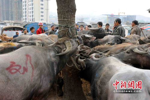 牛馬市場內拴在樹干上待售的耕牛。 中新網發 曹多然 攝