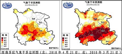 另外,4月21日農(nóng)業(yè)干旱綜合監(jiān)測結(jié)果表明,云南中北部和東部、貴州西南部、四川南部、廣西西北部存在中至重度干旱。與3月21日監(jiān)測結(jié)果比較,貴州西南部、云南東南部、廣西西北部農(nóng)業(yè)干旱得到緩和,云南西部和南部偏西地區(qū)、廣西中東部農(nóng)業(yè)干旱得到緩解。