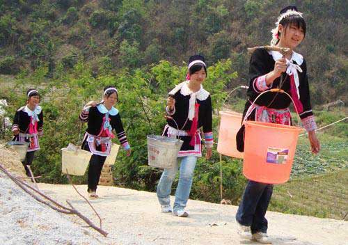 4月8日下午,記者剛到渭徠屯瑤寨時,便看到一群穿著民族服裝的瑤族婦女挑著水走進寨里,然后,每兩人一組分別走進不同的農家。當她們走出農家時,老人們拉著她們的手,連聲道謝,一臉感激之情。