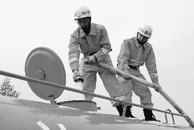 4月1日,貴州省黔西南州興仁縣消防大隊兩名消防士兵緊緊握住水管給抗旱救災(zāi)車灌水。