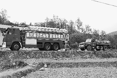 4月1日,貴州省黔西南州興仁縣消防大隊用消防車給魯?shù)A營回族鄉(xiāng)抗旱救災(zāi)拉水車送水。