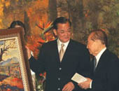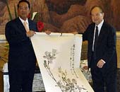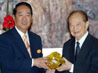 2005年5月2日,連戰(zhàn)向汪道涵轉(zhuǎn)交辜振甫當年的畫作]]>