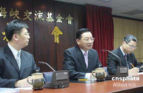 海協會與海基會即將恢復協商會談。六月十日中午,海峽交流基金會董事長江丙坤(中)、副董事長兼秘書長高孔廉(右一),在海基會十七樓第一會議室舉行赴北京商談前的特別記者會。六月十一日,江丙坤將率代表團赴北京。 江丙坤說:“明天,我們開始進行的是一項舉世矚目的活動,大家都在寫歷史。”中新社發 耿軍 攝