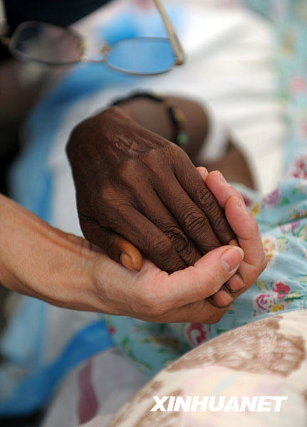 2010年1月20日,在海地首都太子港的醫(yī)療點,醫(yī)生握住一名在地震中受傷的女子的手。當?shù)貢r間2010年1月12日下午16時許,海地發(fā)生里氏7.3級強烈地震,造成首都太子港大量房屋受損或坍塌,并導致大量人員傷亡。