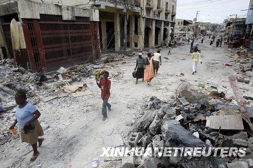 1月25日,在海地首都太子港,人們從房屋的廢墟旁經(jīng)過。世界衛(wèi)生組織官員1月26日在太子港說,1月12日海地地震已造成11.3萬人喪生,19.6萬人受傷。新華社/路透