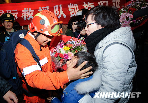 1月27日,救援隊(duì)隊(duì)員家人在首都國(guó)際機(jī)場(chǎng)迎接救援隊(duì)隊(duì)員歸來(lái)。新華社記者王建華攝