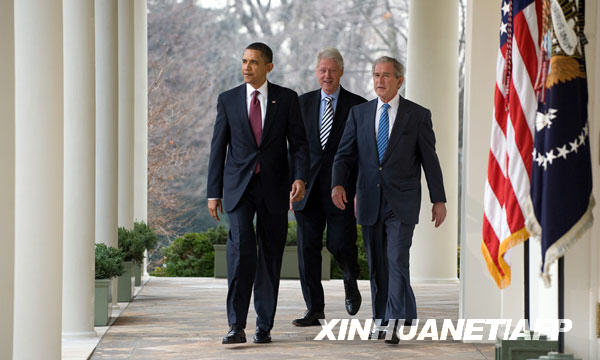 1月16日,美國總統奧巴馬(左)和兩位前總統克林頓(中)、小布什(右)在白宮出席新聞發布會。新華社/法新