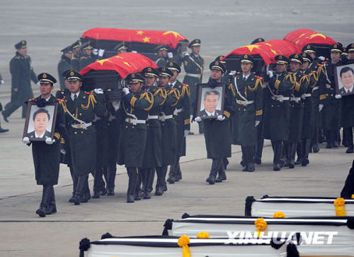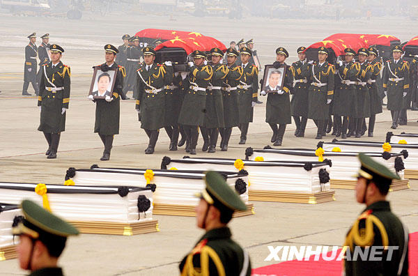 1月19日,禮兵護送八位烈士的靈柩,靈柩上覆蓋著中華人民共和國國旗。當日,專程接運在海地地震災害中遇難的八位中國維和警察靈柩的專機抵達北京首都國際機場。新華社記者金良快攝
