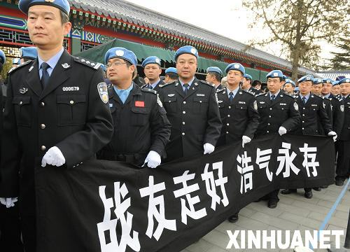 1月20日,向海地地震遇難中國維和警察遺體送別儀式在北京八寶山革命公墓禮堂舉行。這是曾經參加過海外維和任務的警察準備進入禮堂送別戰友。新華社記者謝環馳攝
