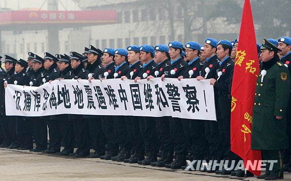 1月19日,專程接運在海地地震災害中遇難的八位中國維和警察靈柩的專機抵達北京首都國際機場。這是維和警察代表打出悼念戰友的橫幅。新華社記者 龐興雷 攝