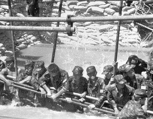 這是解放軍南京軍區某部紅軍團戰士在長江大堤決口處用人堤堵住決口(資料照片)。新華社發