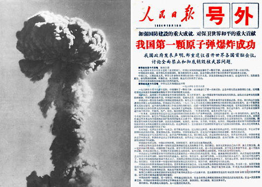 1964年10月16日15時,中國在西部地區爆炸了一顆原子彈,成功地實現了第一次核實驗。