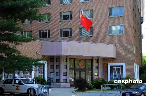 資料圖片:中國(guó)駐美大使館老館——坐落美國(guó)華盛頓特區(qū)西北區(qū)的“溫莎公園”旅館。圖為去年五月十九日,中國(guó)為四川地震死難者進(jìn)行全國(guó)哀悼的第一天,駐美大使館降半旗悼念死難同胞。 中新社發(fā) 邱江波 攝
