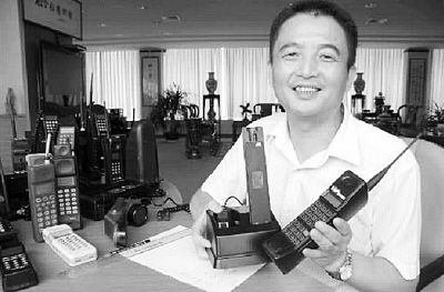 民間收藏家謝金松展示中國第一部模擬手機yd-9100型手機。它是1991年中國郵電四所和江陰智能公司合作研發出的,還來不及正式進入市場就被通知停止生產,原因是進口“磚頭機”已進入中國市場。