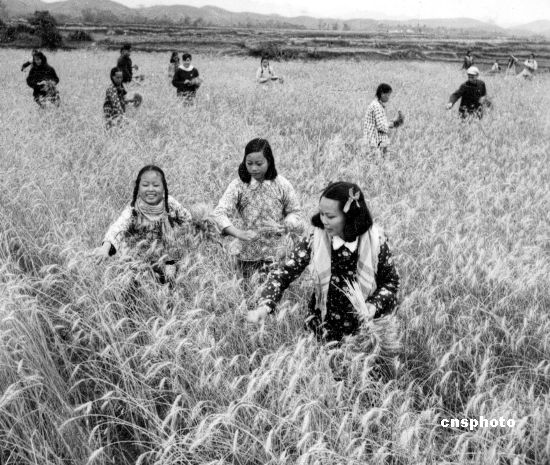 廣西僮族自治區(qū)東南部博白縣沙河八一人民公社的4082畝小麥獲得豐收,社員正在豐盛的麥田里選種。 中新社資料圖