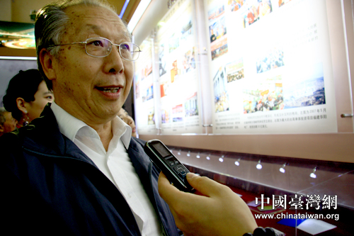 在介紹兩岸重要協商成果的展板前,記者巧遇了“金門協議”大陸方面的協議簽署人——中國紅十字會前秘書長韓長林老先生。