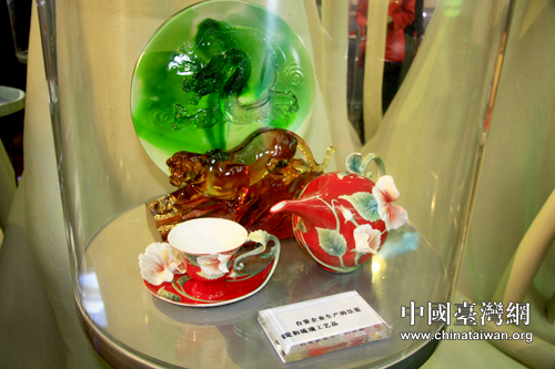 在“兩岸關系發展展區”內展示的由臺資企業生產的琉璃工藝品(中國臺灣網 李徽 攝)