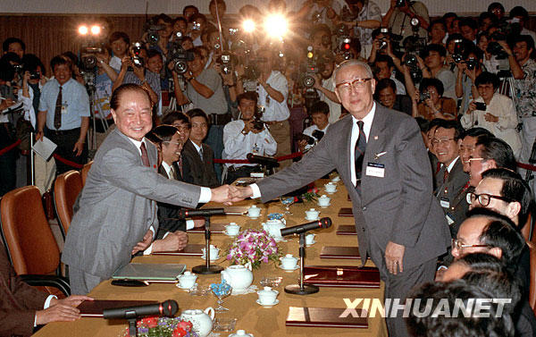 1993年4月,海峽兩岸兩個民間團體的領導人汪道涵和辜振甫在新加坡會晤。這是1993年4月27日,海峽兩岸關系協(xié)會會長汪道涵(左)與海峽兩岸交流基金會董事長辜振甫首次會談前握手。新華社發(fā)