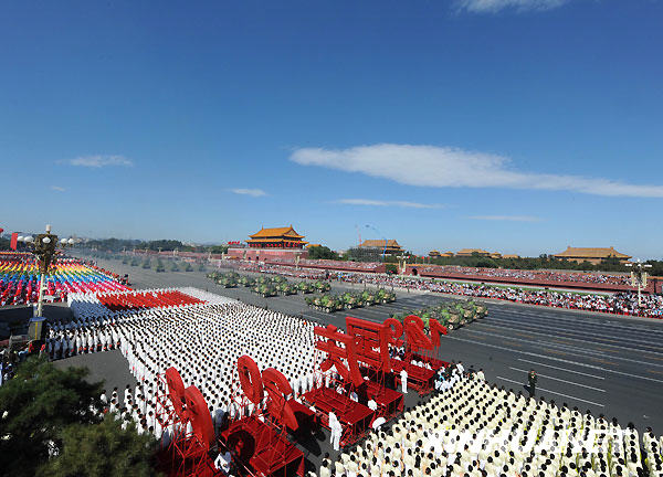 10月1日,首都各界慶祝中華人民共和國成立60周年大會在北京舉行。這是受閱部隊通過天安門廣場。新華社記者 丁林攝