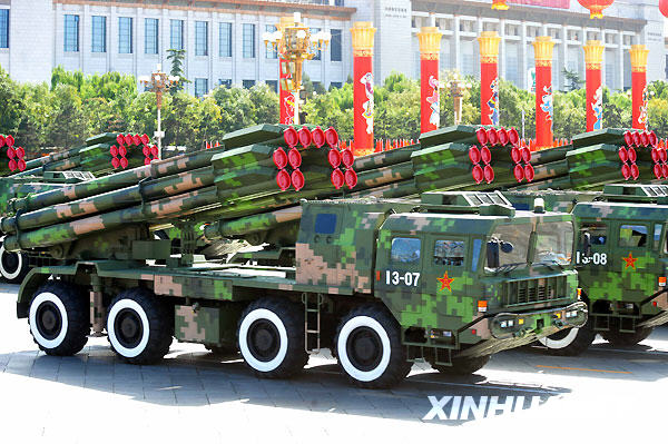10月1日,首都各界慶祝中華人民共和國成立60周年大會在北京舉行。這是遠程火箭炮方隊通過天安門廣場。新華社記者李曉果攝