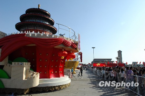10月2日下午,北京天安門廣場展示參加國慶60周年慶典群眾游行方陣中的彩車。 中新社發 侯宇 攝