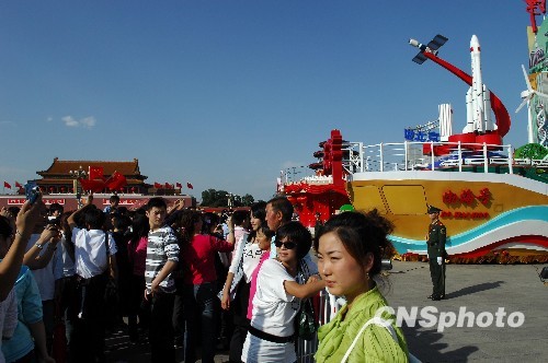 10月2日下午,北京天安門廣場展示參加國慶60周年慶典群眾游行方陣的彩車,吸引大量游客到現場參觀。 中新社發 侯宇 攝