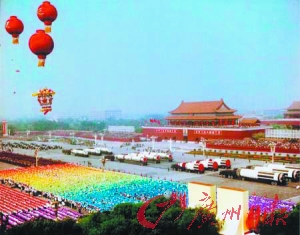 我覺得自己很是神氣,因為我站在第一排,手里的花環是亮麗的紅色。整整一個暑假,我們在學校的操場、在機場的停機坪上、甚至在天安門廣場演練,走正步喊口號,有節奏地揮舞花環。