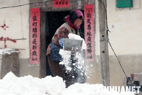 1月30日,岳西縣石關鄉一村民清掃門前積雪。 當日,地處大別山區的安徽岳西縣再遭暴雪襲擊,岳西縣石關鄉積雪超過60厘米,交通受阻,當地群眾生活受到嚴重影響。 新華社發(儲永志 攝)