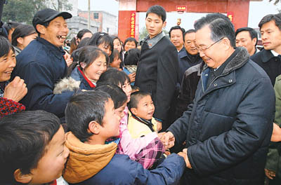 2月6日,中共中央政治局常委、國務(wù)院總理溫家寶結(jié)束貴州的考察工作,立即趕到江西災(zāi)區(qū),指導(dǎo)抗災(zāi)救災(zāi)和災(zāi)后恢復(fù)生產(chǎn)工作,看望慰問干部群眾。這是溫家寶在撫州市臨川區(qū)云山鎮(zhèn)圳上村看望慰問受災(zāi)村民。新華社記者 姚大偉攝