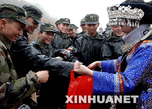 2月17日,當(dāng)?shù)厝罕娮园l(fā)前來慰問解放軍官兵。當(dāng)日,成都軍區(qū)某部百名官兵在貴州省黔東南州三穗縣搶修遭受凝凍災(zāi)害的青穗輸電主干線。這條線路是三穗縣連接國家電網(wǎng)的主要通道。 新華社發(fā)(黃震 攝)