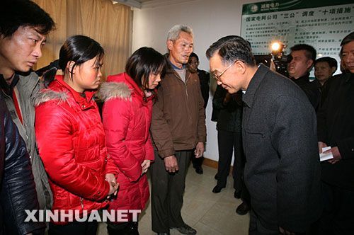 1月29日,中共中央政治局常委、國務院總理溫家寶在湖南長沙看望在沙坪變電站除冰搶險中不幸殉職的周景華、羅長明、羅海文3名電力職工的家屬。溫家寶總理說:“今天面對你們,我無法用更多的語言來表示安慰,我給你們鞠個躬吧!”新華社記者 姚大偉攝