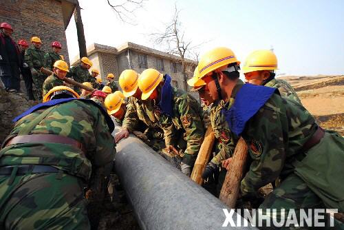 2月14日,部隊官兵在搬運電線桿。新華社發(黃曉海 攝)