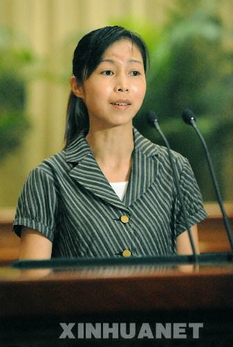 這是陜西省漢中市寧強縣黃壩驛鄉中心學校教師王敏在報告會上發言(6月11日攝)。 當日,共青團十六大抗震救災英模事跡報告會在北京人民大會堂舉行。 新華社記者 陳曉偉 攝