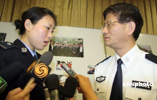 公安部長慰問地震災區堅強女警察蔣敏,網友則親切稱她為“最堅強警花”。中新社發 孫自法 攝