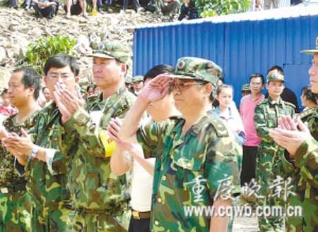重慶晚報5月29日報道 “對不起,我來晚了,你受苦了”,27日中午,剛剛抵達青川抗震救災前指的四川省軍區司令員夏國富將軍,迎著小跑過來的袁仕聰就是一個標準的軍禮。