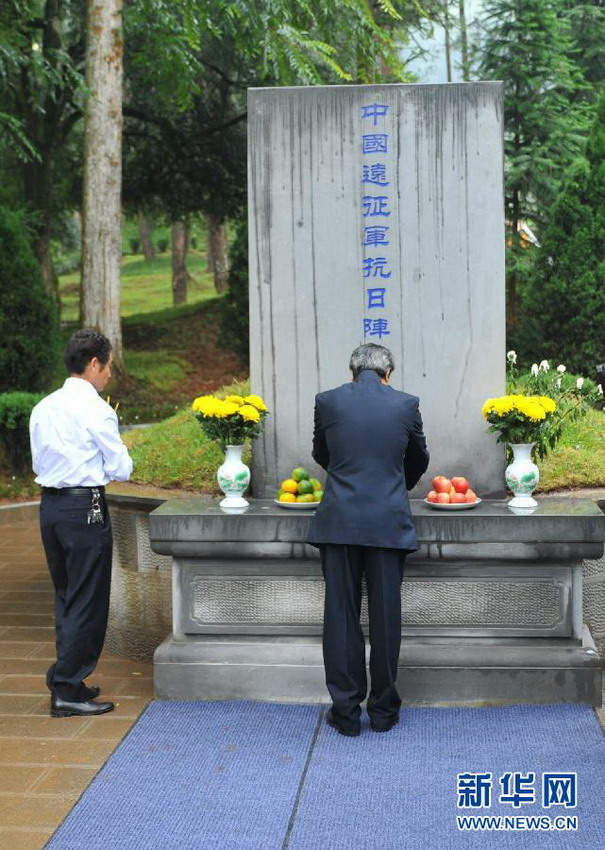 2011年9月14日,在云南省騰沖縣國殤墓園,騰沖鄉賢為中國遠征軍抗日陣亡將士墓敬獻香花果酒。