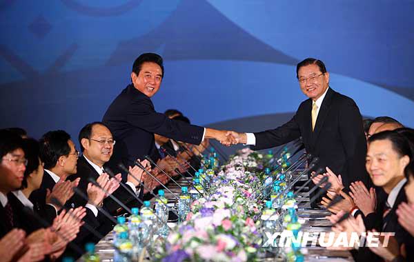 11月4日,海峽兩岸關系協會會長陳云林(左立者)與海峽交流基金會董事長江丙坤(右立者)在臺北舉行正式會談。新華社記者 邢廣利 攝 海協會會長陳云林與海基會董事長江丙坤今天(11月4日)14時許在臺北就兩岸海運直航、平日包機、郵政、食品安全等四項議題簽署了協議。據稱,采取空中直達航路之后,臺北到北京的飛航時間只需2個多小時,到上海只需80多分鐘。