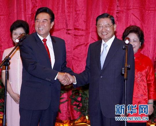6月28日,由江丙坤董事長率領的海基會協商代表團一行抵達下榻的重慶申基索菲特大酒店,受到海協會會長陳云林的熱情歡迎。這是陳云林(前左)和江丙坤(前右)在歡迎儀式上握手。新華社記者陳建力攝