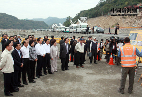 12月24日上午,海協會會長陳云林一行在南投水里新山村壽山橋“莫拉克”風災災區聽取有關介紹。(中國臺灣網 李徽 攝)