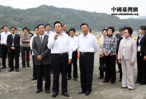 12月24日上午,海協會會長陳云林一行在臺灣海基會董事長江丙坤陪同下到南投水里新山村壽山橋“莫拉克”風災災區進行參訪。(中國臺灣網 李徽 攝)