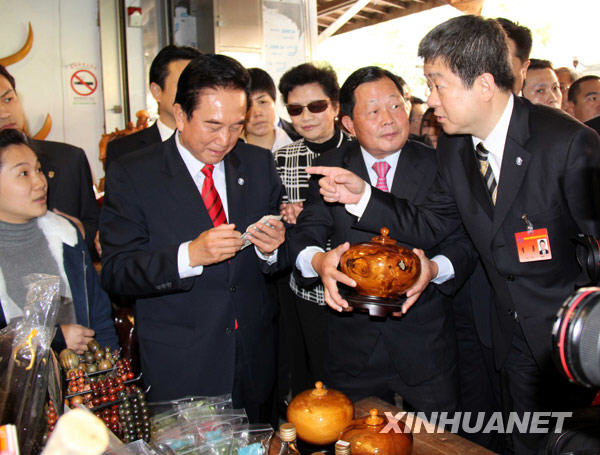 12月23日,海協會會長陳云林(前右二)在觀看木雕大師制作木雕作品。新華社記者 袁滿 攝