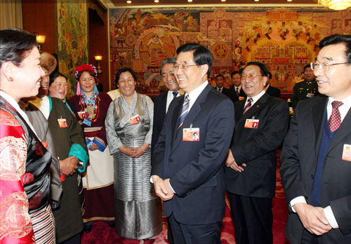 3月5日,中共中央總書記、國家主席、中央軍委主席胡錦濤參加十屆全國人大五次會議西藏代表團(tuán)的審議。這是胡錦濤與代表們親切交談。 新華社記者樊如鈞攝