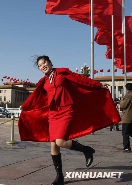3月5日,為兩會服務的工作人員在北京人民大會堂前拍照留念。新華社記者劉衛兵攝