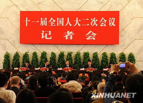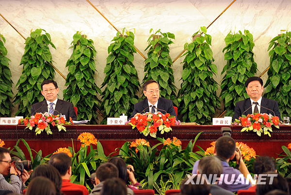 3月10日,十一屆全國人大二次會議舉行記者會,工業和信息化部部長李毅中、人力資源和社會保障部部長尹蔚民、商務部部長陳德銘答記者問。新華社記者陳樹根攝